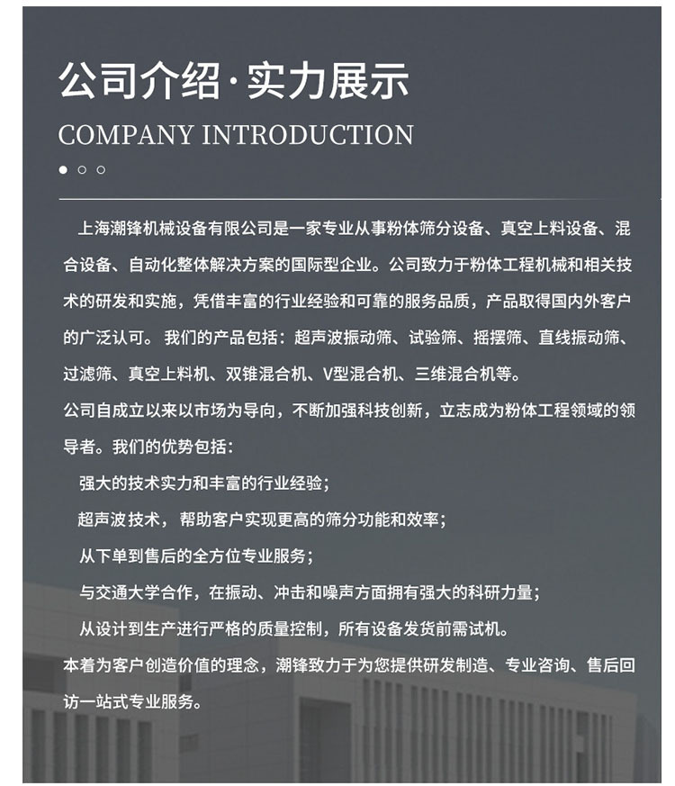 上海潮鋒機(jī)械設(shè)備有限公司是一家專業(yè)從事粉體篩分設(shè)備、真空上料設(shè)備、混合設(shè)備、自動化整體解決方案的國際型企業(yè)。公司致力于粉體工程機(jī)械和相關(guān)技術(shù)的研發(fā)和實(shí)施,憑借豐富的行業(yè)經(jīng)驗(yàn)和可靠的服務(wù)品質(zhì),產(chǎn)品取得國內(nèi)外客戶的廣泛認(rèn)可。 我們的產(chǎn)品包括:超聲波振動篩、試驗(yàn)篩、搖擺篩、直線振動篩、過濾篩、真空上料機(jī)、無塵投料站、雙錐混合機(jī)、V型混合機(jī)、三維混合機(jī)、臥式螺帶混合機(jī)、槽式混合機(jī)等。